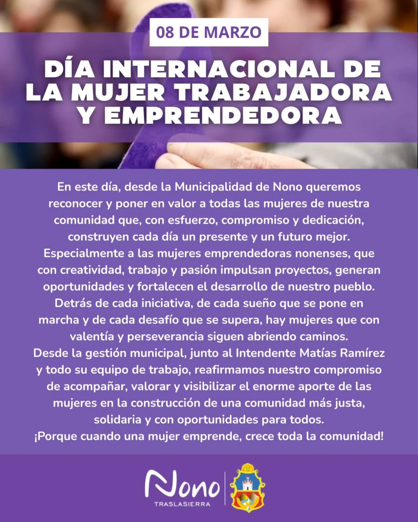 En este día, desde la Municipalidad de Nono queremos reconocer y poner en valor a todas las mujeres de nuestra comunidad que, con esfuerzo, compromiso y dedicación, construyen cada día un presente y un futuro mejor.