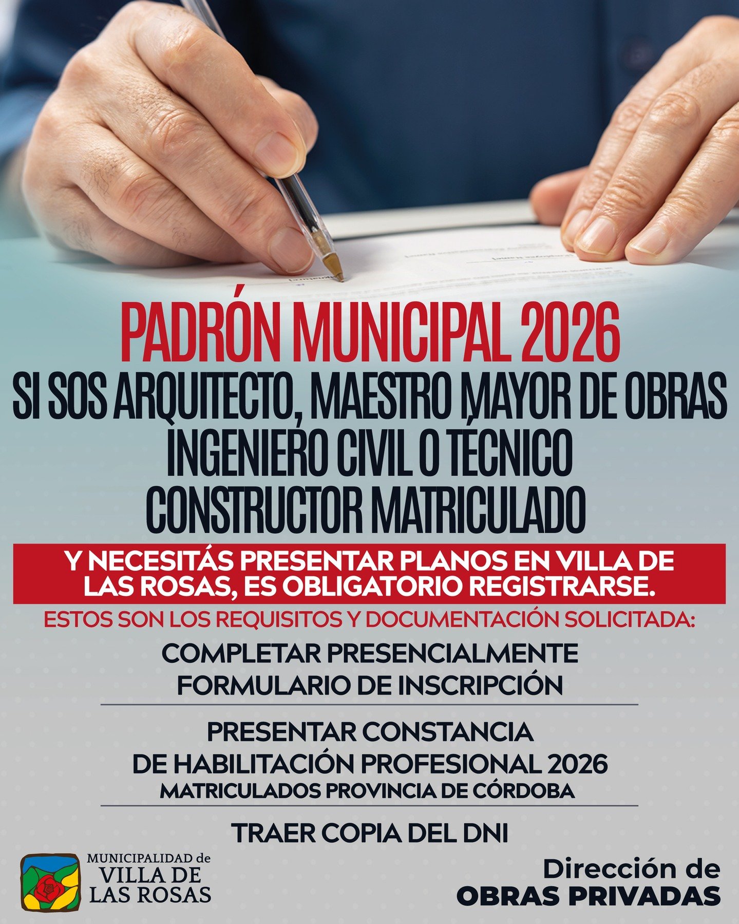 Si sos Arquitecto, Maestro Mayor de Obras, Ingeniero Civil o Técnico Constructor Matriculado y necesitás presentar planos en Villa de las Rosas, recordá que es obligatorio estar al día con el Padrón Municipal.