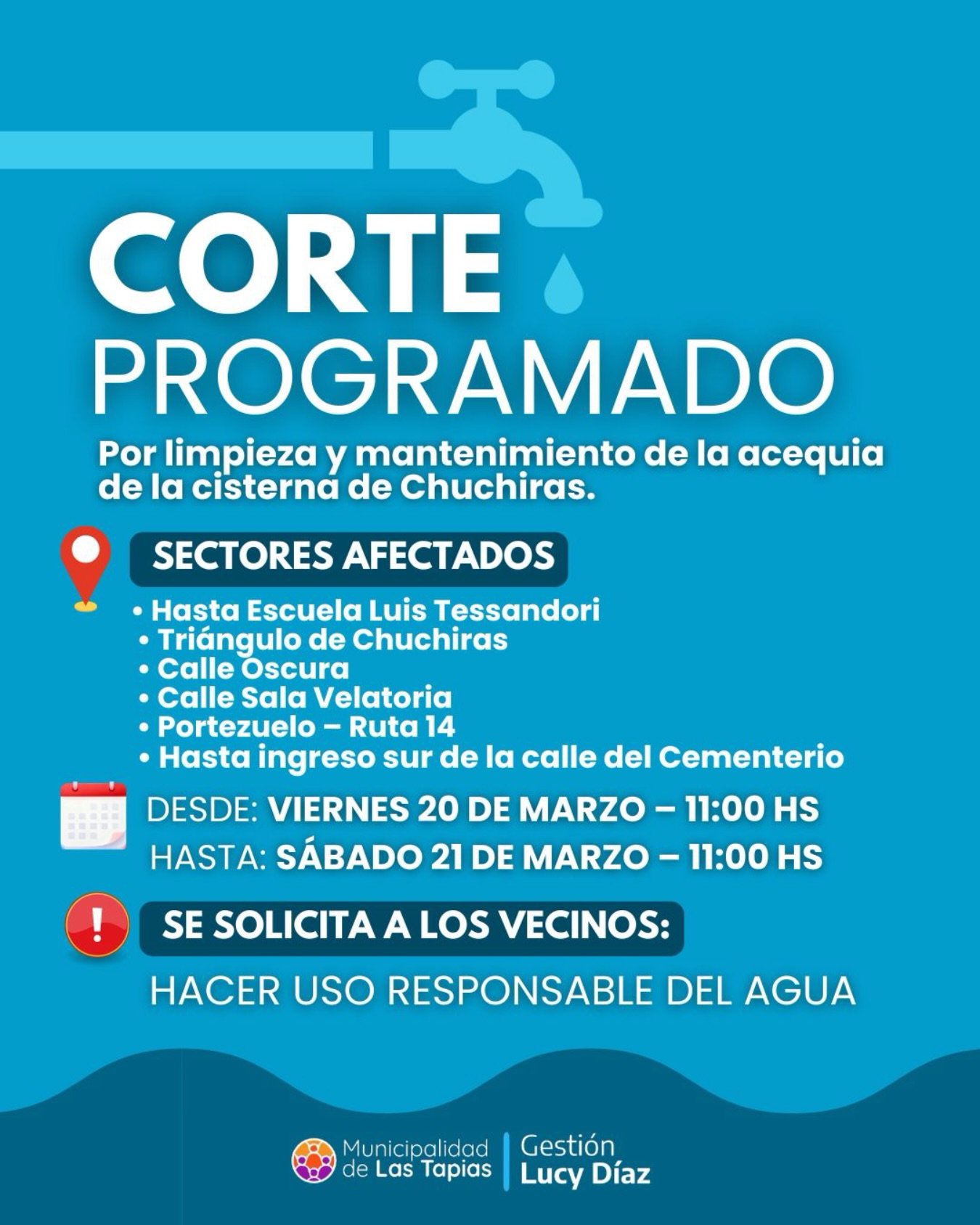 La Municipalidad de Las Tapias informa a los vecinos que se realizará un corte en el suministro de agua de la cisterna de Chuchiras, debido a tareas de limpieza y mantenimiento de la acequia.
