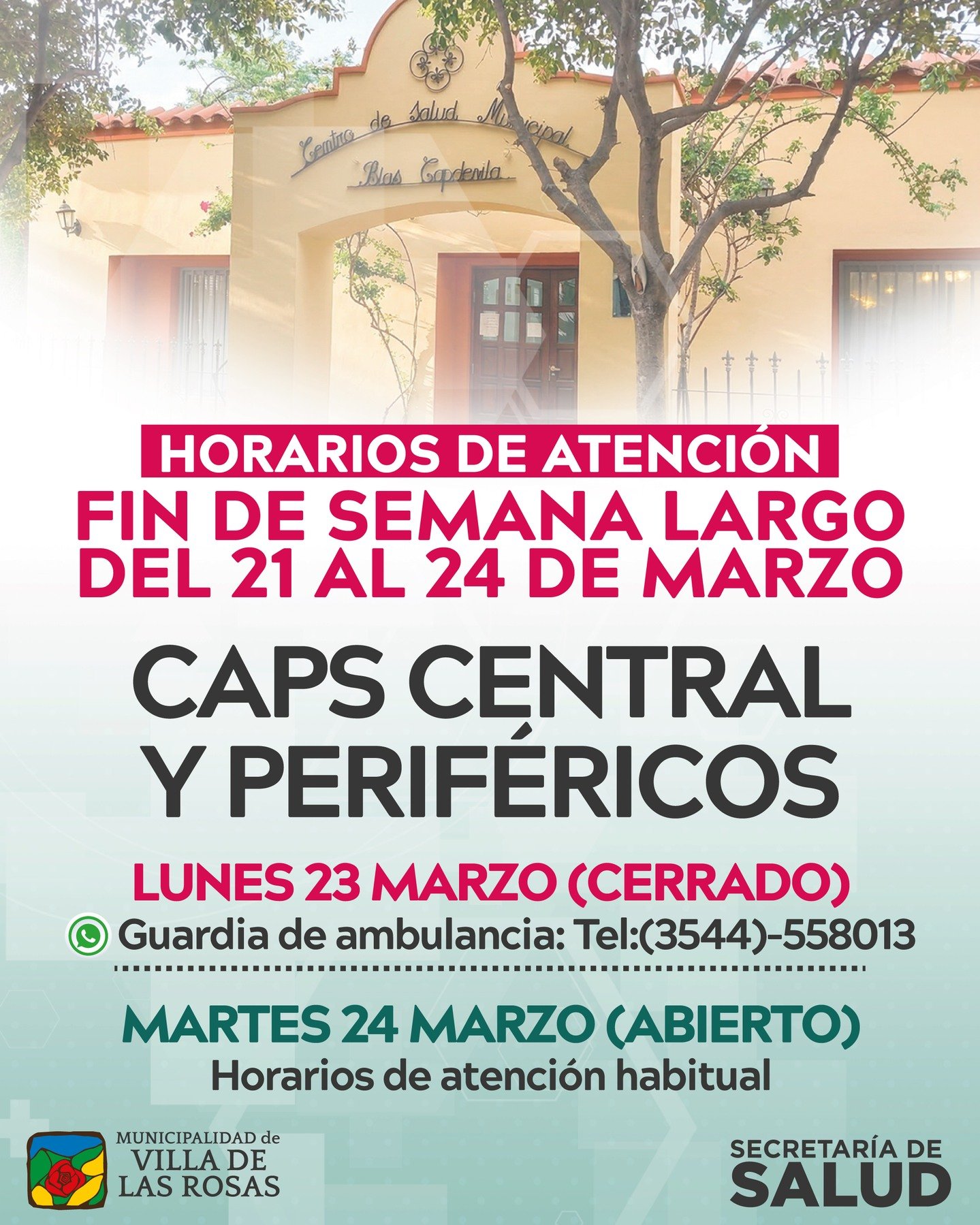 🚑 Lunes 23/03: Sin atención – Guardia de ambulancia: 3544-558013. (Feriado con fines turísticos).