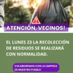 ¡ATENCIÓN VECINOS! EL LUNES 23 LA RECOLECCIÓN DE RESIDUOS SE REALIZARÁ CON NORM