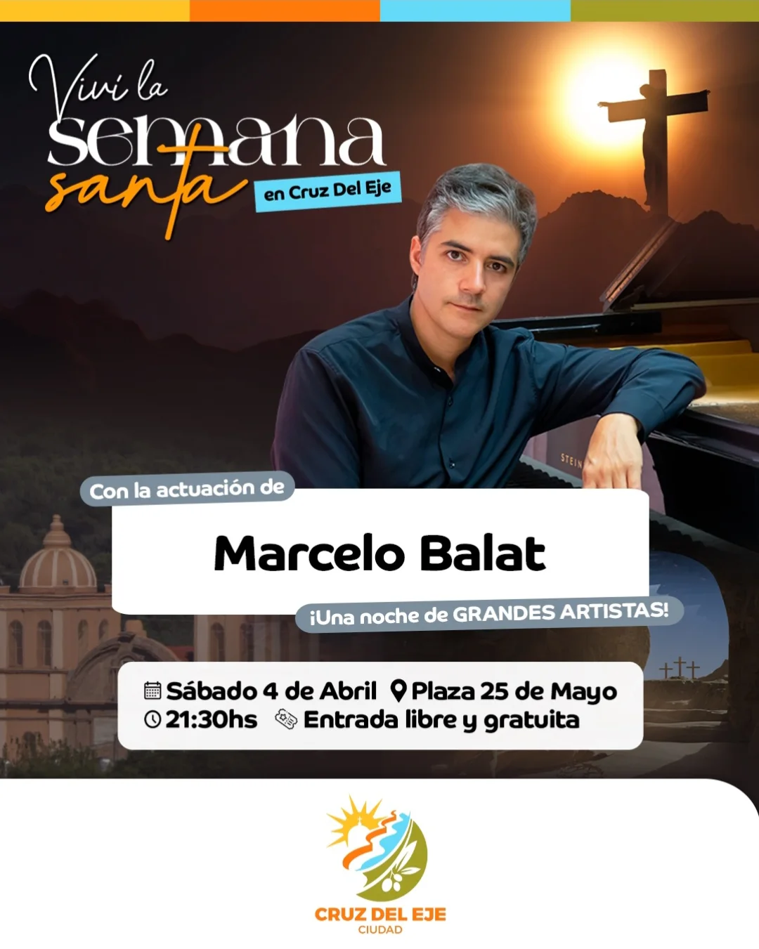26 marzo, 2026🎹 Esta Semana Santa viviremos una noche especial con la presentación de Marcelo Balat, reconocido pianista y solista titular de la Orquesta Sinfónica Nacional Argentina, que vuelve a nuestra ciudad para compartir su música con toda la comunidad.