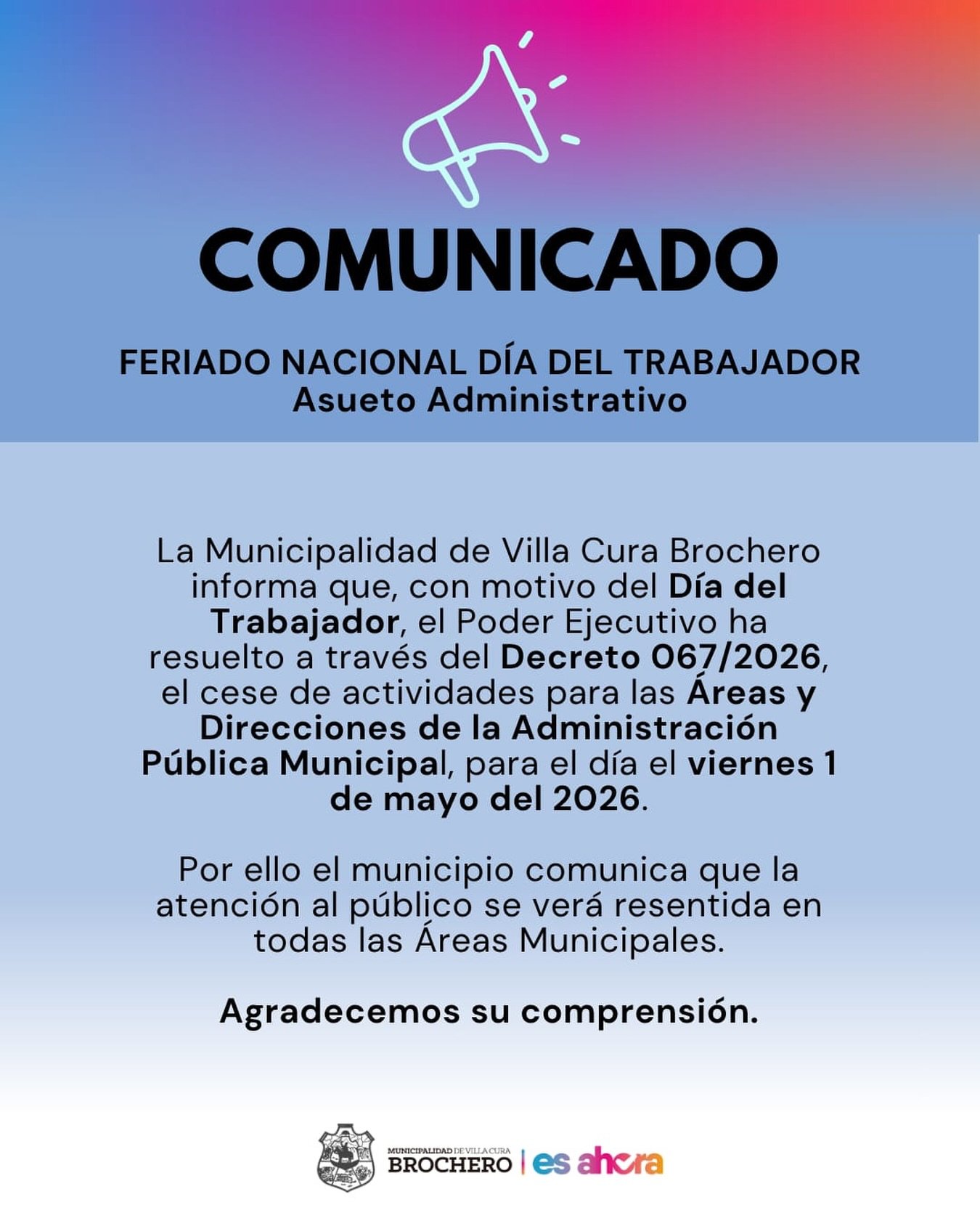 La Municipalidad de Villa Cura Brochero informa que, con motivo del Día del Trabajador, el Poder Ejecutivo ha resuelto a través del Decreto 067/2026, el cese de actividades para las Áreas y Direcciones de la Administración Pública Municipal, para el día el viernes 1 de mayo del 2026.