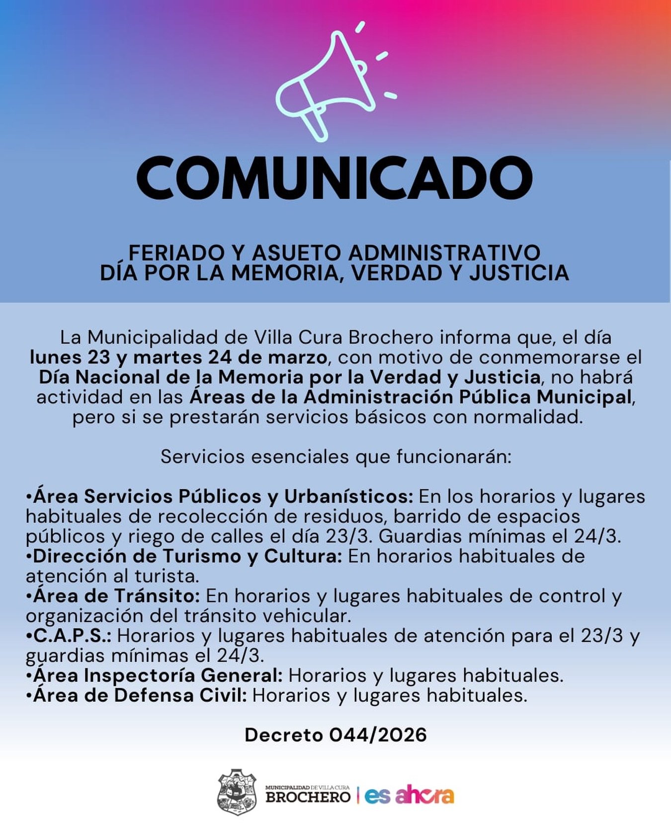 🙌🏾La Municipalidad de Villa Cura Brochero informa que, con motivo de conmemorarse el Día Nacional de la Memoria por la Verdad y Justicia, el Poder Ejecutivo ha resuelto a través del Decreto 044/2026 declarar asueto administrativo para las Áreas de la Administración Pública Municipal e Instituciones Públicas de la localidad los días lunes 23 y martes 24 de marzo del 2026, pero si se prestarán servicios básicos con normalidad.
