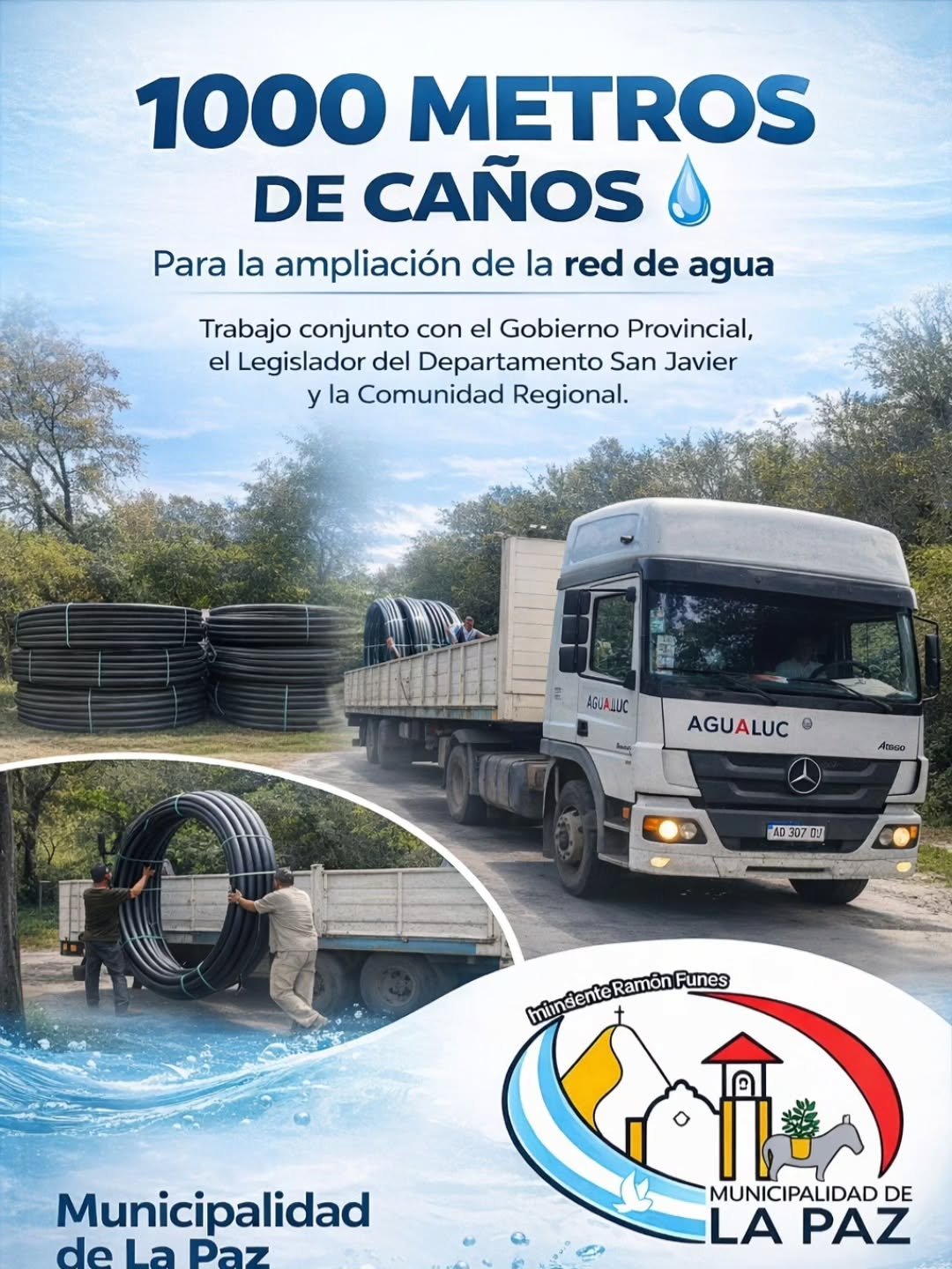 La Municipalidad de La Paz informa la recepción de 1000 metros de cañería, destinados a la ampliación y mejora de la red de agua en nuestra localidad.
