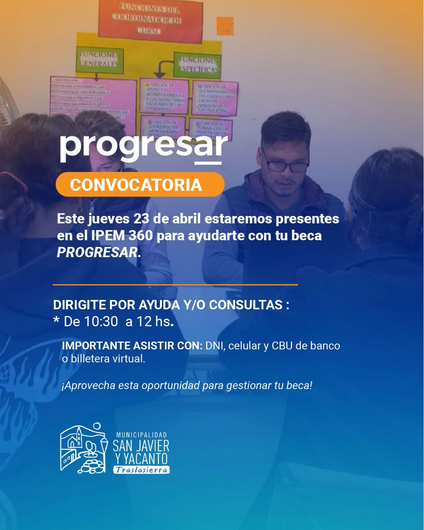 Este jueves 23/04 vamos a estar presentes en el IPEM 364 realizando inscripciones para la Beca Progresar‼️