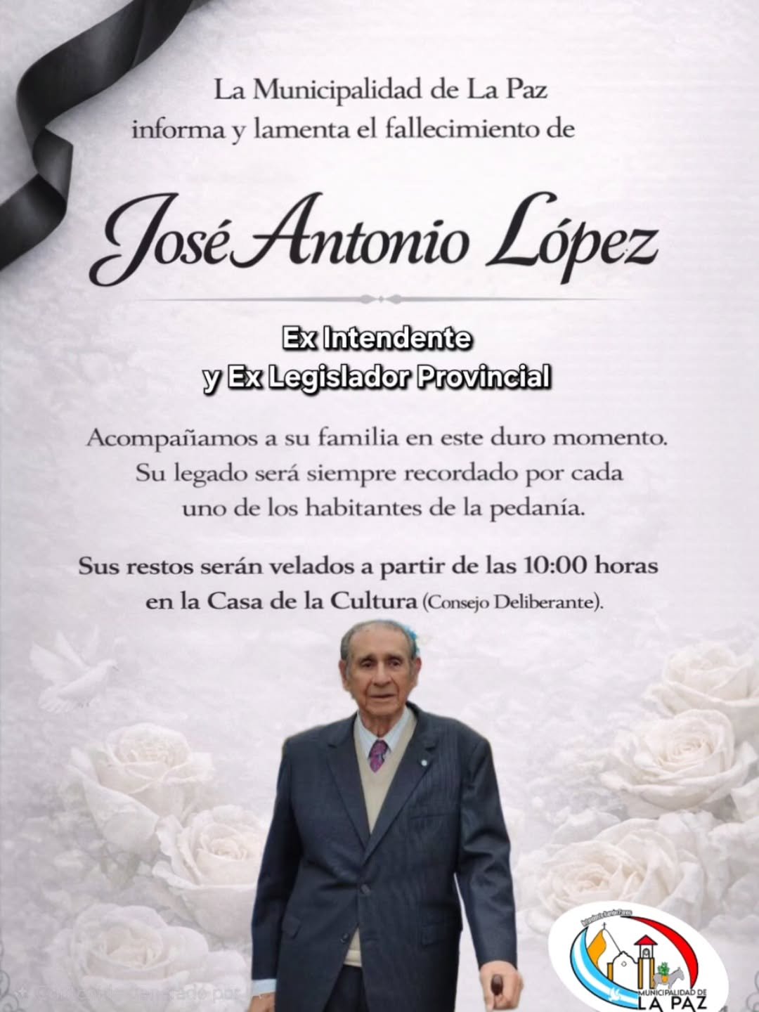 La Municipalidad de La Paz informa a toda la comunidad y lamenta profundamente el fallecimiento de José Antonio López, quien se desempeñara como exintendente municipal y exdiputado provincial.