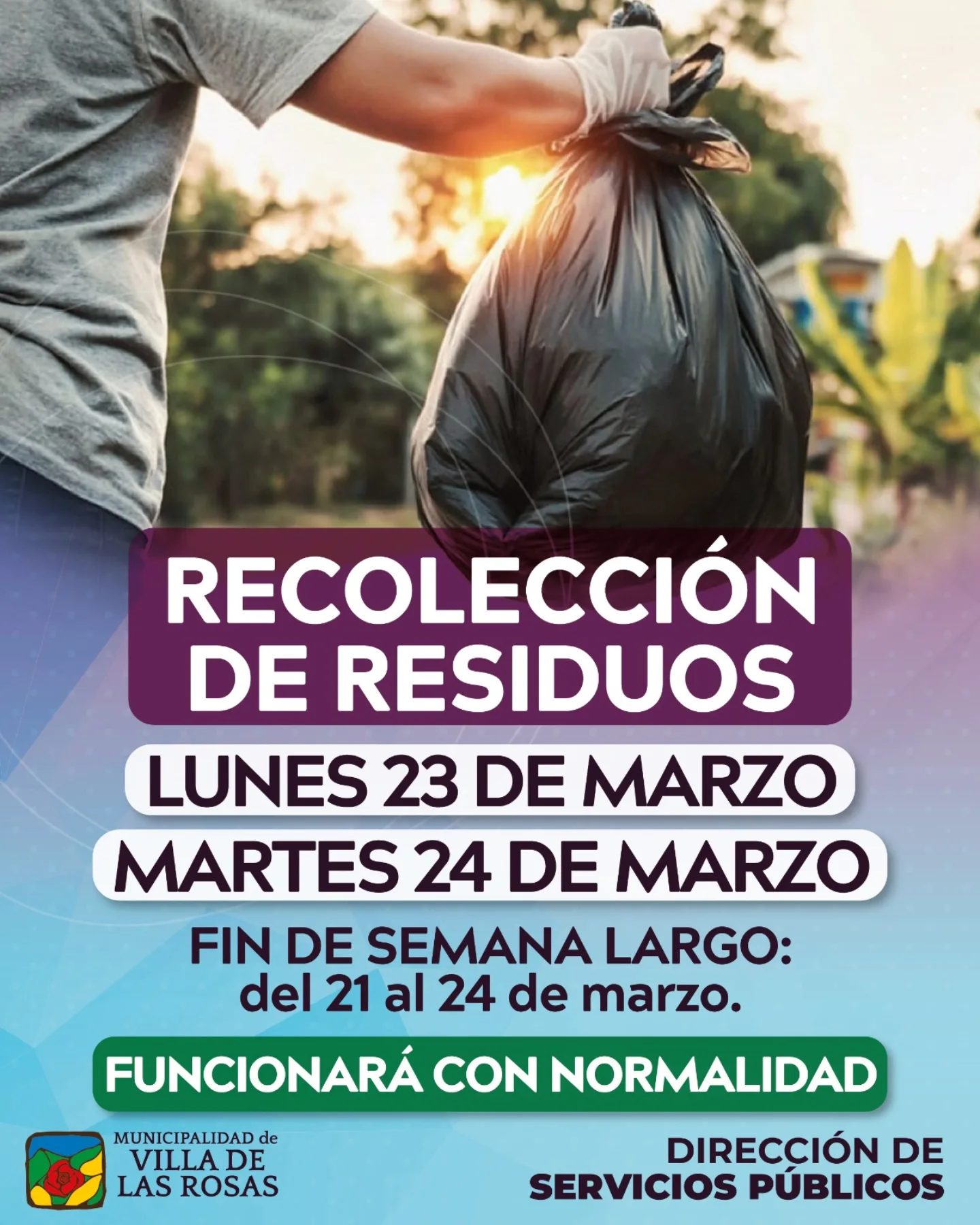 Este finde largo, seguimos trabajando para mantener Villa de Las Rosas limpia. Te confirmamos que el servicio funcionará con total normalidad los días: