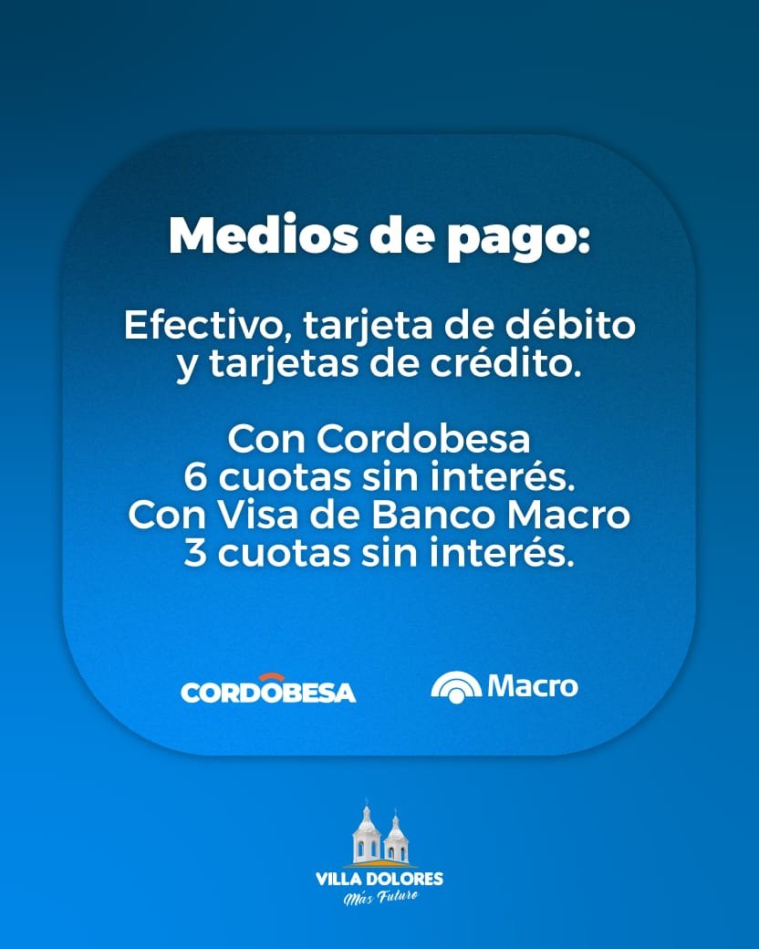 Medios de pago: efectivo, QR, tarjeta de débito o crédito. Con Cordobesa, 6 cuotas sin interés, y con Visa del Banco Macro, 3 cuotas sin interés.