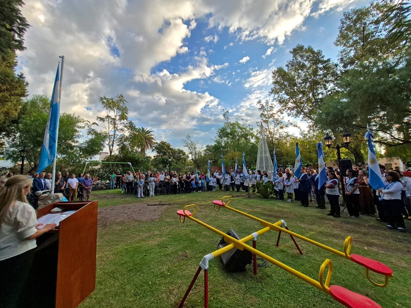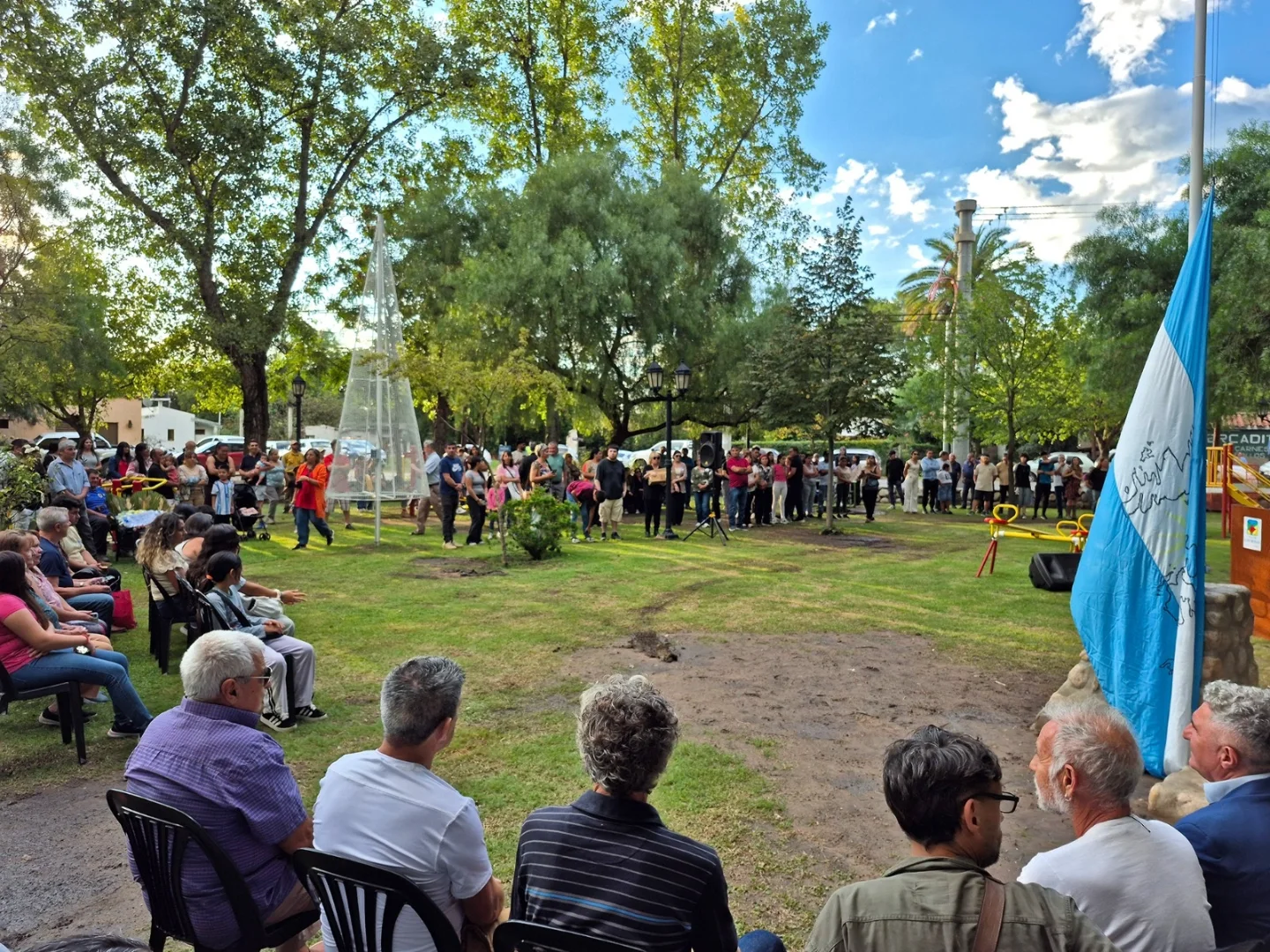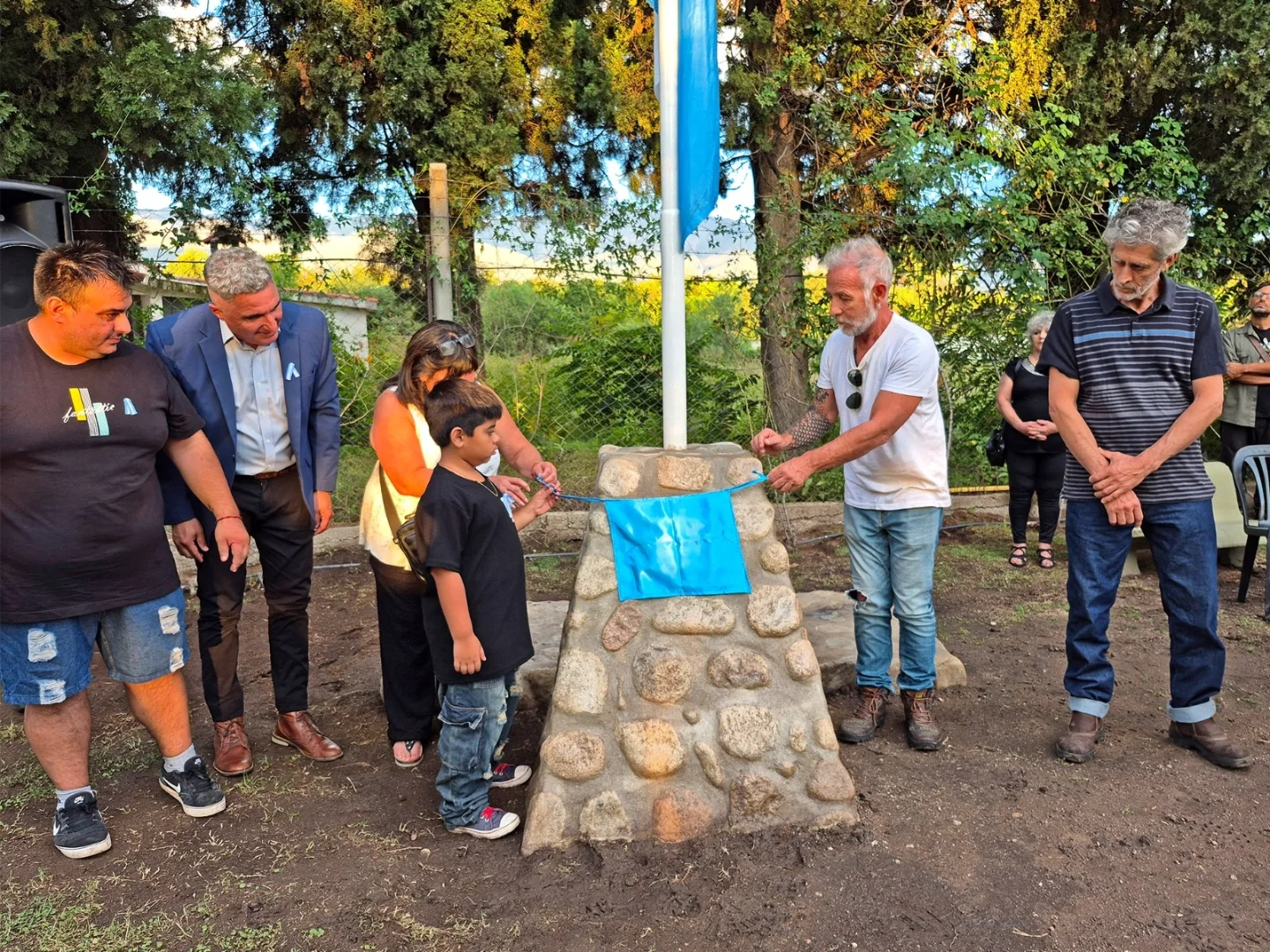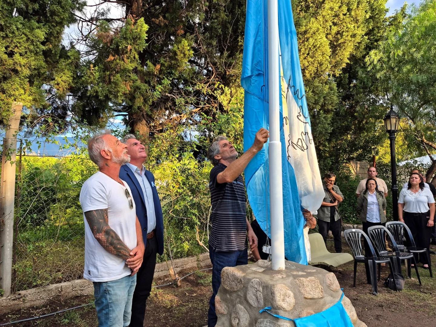 Durante la ceremonia se vivieron momentos de profunda emoción, como el izamiento de la bandera en el nuevo mástil, el descubrimiento de una placa en homenaje al veterano Luis Alberto Manzone, acompañado por una ofrenda floral de sus amigos.